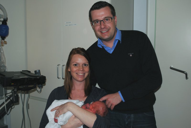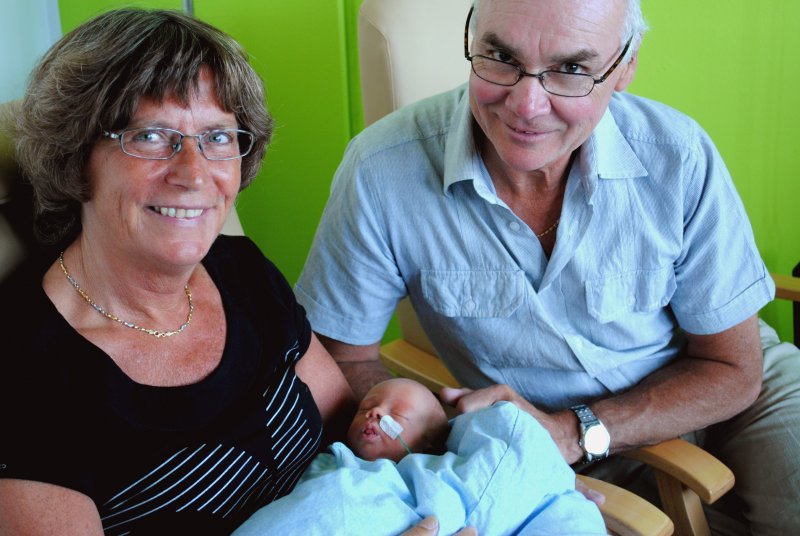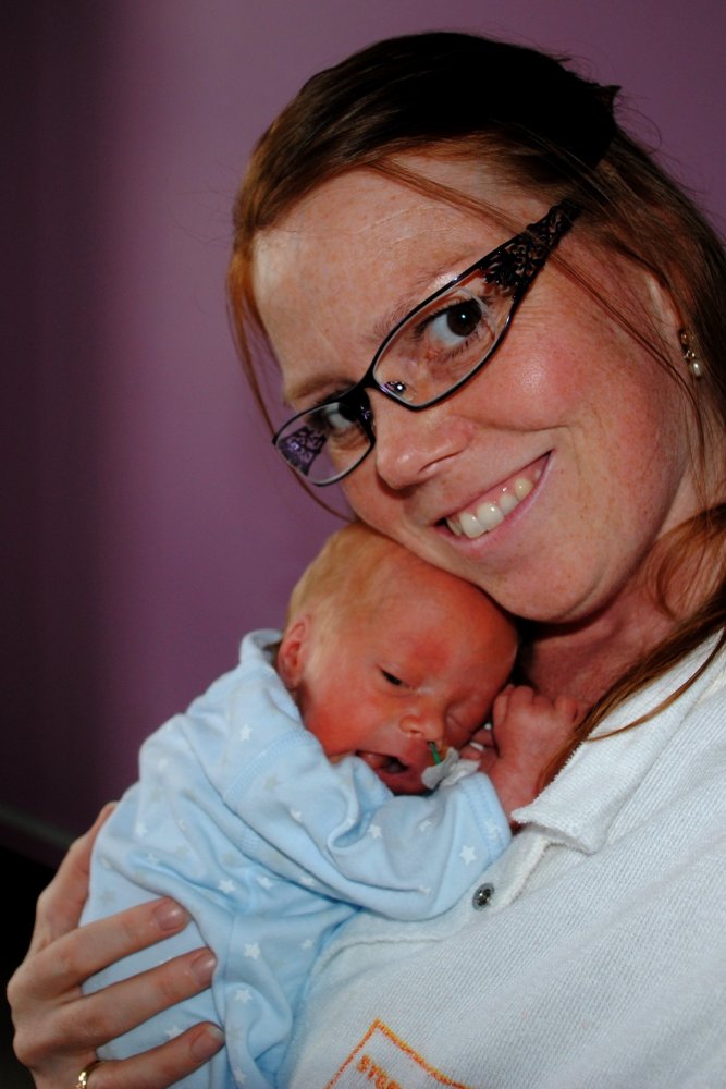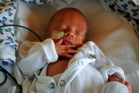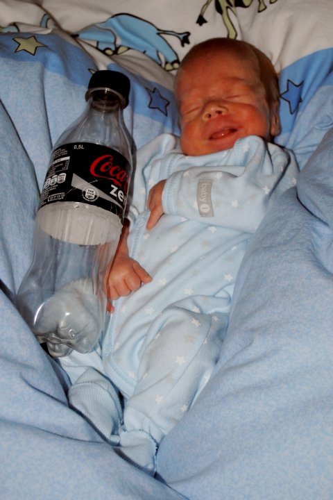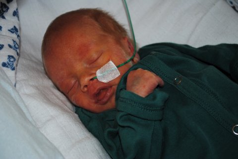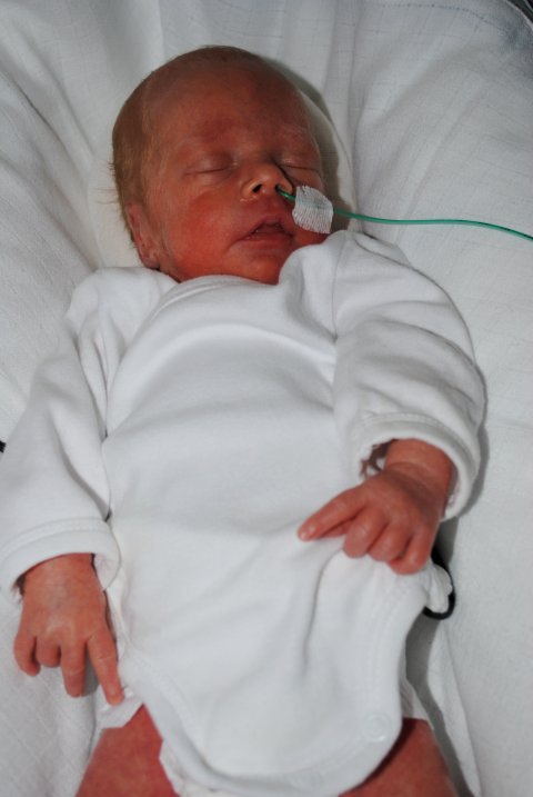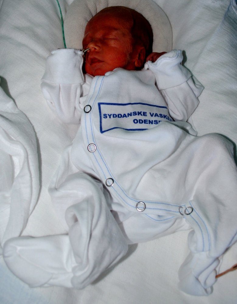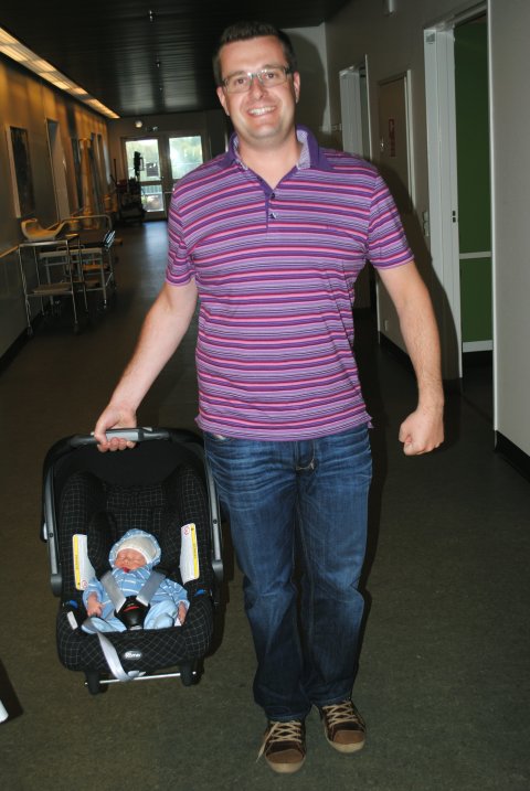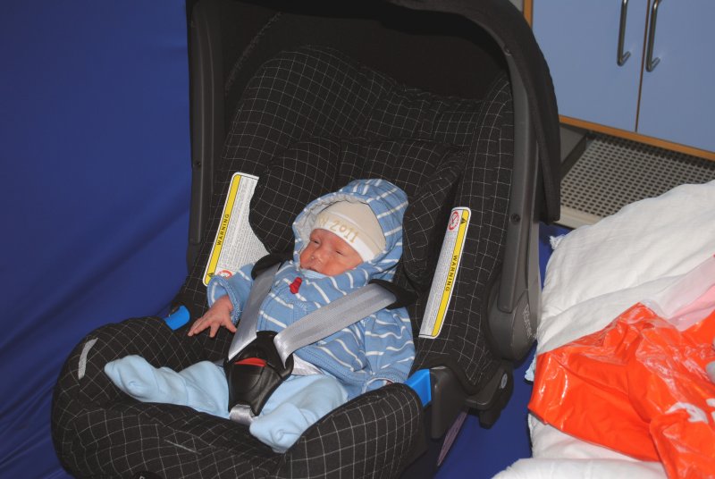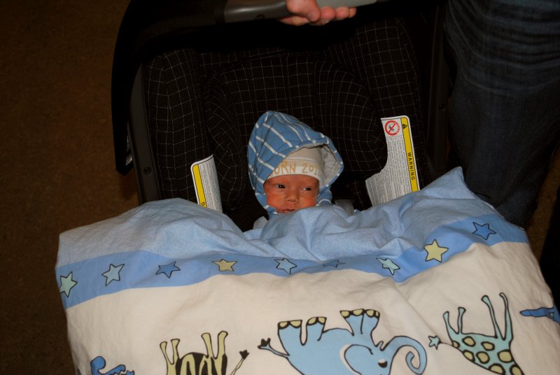 På vej hjem fra hospitalet, 3½ uge gammel og vejer 2.300 gram.